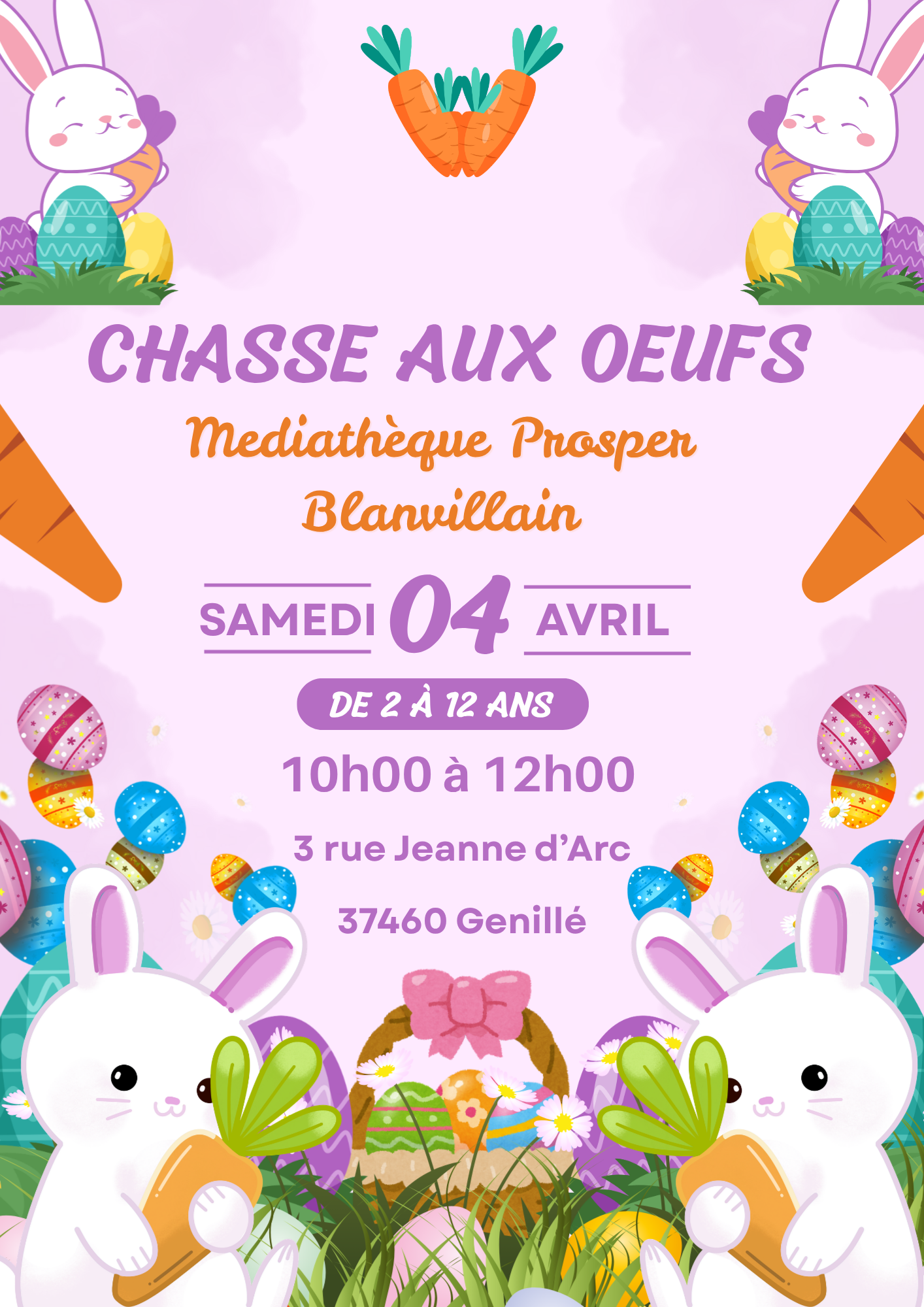 La Médiathèque Prosper Blanvillain vous propose une chasse aux oeufs le samedi 04 avril à la médiathèque de 10h à 12h pour les enfants de 2 à 12 ans.